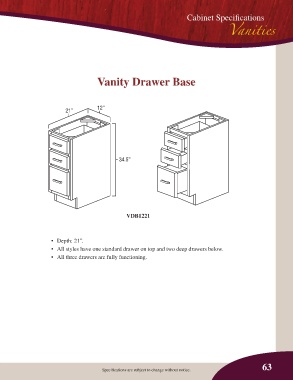 Cabinet Specifications Vanities Vanity Drawer Base VDB1221 • Depth: 21”. • All styles have one standard drawer on top and two deep drawers below. • All three drawers are fully functioning. 63 Specifications are subject to change without notice.