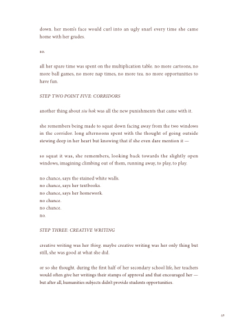 she remembers being made to squat down facing away from the two windows in the corridor. long afternoons spent with the thought of going outside stewing deep in her heart but knowing that if she even dare mention it —