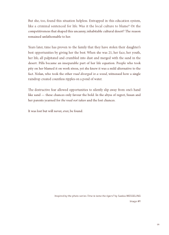 But she, too, found this situation helpless. Entrapped in this education system, like a criminal sentenced for life. Was it the local culture to blame? Or the competitiveness that shaped this uncanny, inhabitable cultural desert? The reason remained unfathomable to her.