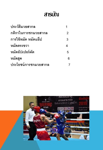 สารบัณ ประวัติมวยสากล 1 กติกาในการชกมวยสากล 2 การใช้หมัด หมัดแย็ป 3 หมัดตรงขวา 4 หมัดอัปเปอร์คัต 5 หมัดฮุค 6 ประโยชน์การชกมวยสากล 7