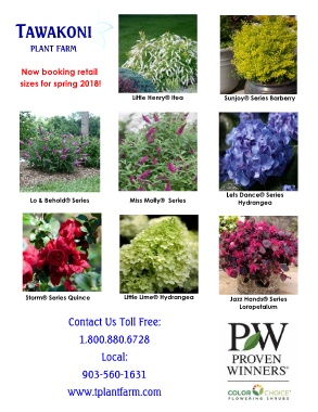 PLANT FARM Now booking retail sizes for spring 2018! Little Henry® Itea Sunjoy® Series Barberry Lets Dance® Series Lo & Behold® Series Miss Molly® Series Hydrangea Storm® Series Quince Little Lime® Hydrangea Jazz Hands® Series Loropetalum