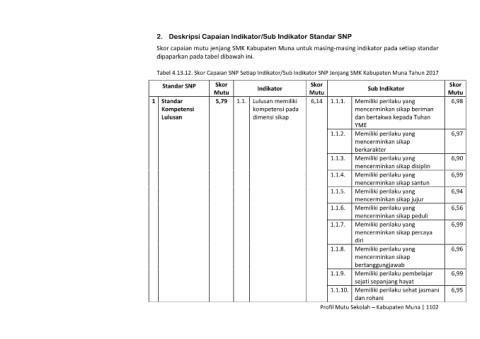 Tabel 4.13.12. Skor Capaian SNP Setiap Indikator/Sub Indikator SNP Jenjang SMK Kabupaten Muna Tahun 2017
