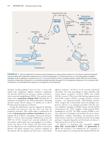 during activation. A: Complement components (C3a, C5a) attract phagocytes (1) to inflammatory sites (2), where they ingest and degrade