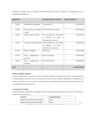Al ser un fondo de becas, no se tiene un ingreso estimado a generar. Sin embargo de acuerdo a la información de la Cuenta Satélite del periodo 2010 al 2013 las becas de los fondos estatales disponibles en el Ministerio de Cultura y Juventud, para el sector de las artes escénicas como empleo no formal indicaba ocupación del un 23% de la población especializada en ello.