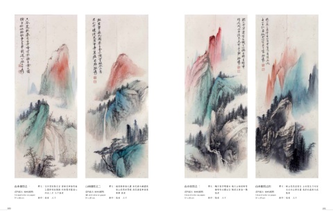 山水冊頁之一 釋文│空谷跫狀慕足音 雲峰窅渺接青禽 山水冊頁之二 釋文│凝碧叢叢接九閽 染花喬木識靈根 山水冊頁之三 釋文│觸石雲浮雙鬢白 截天山接兩眸青 山水冊頁之四 釋文│晚山怱怱看雲生 山有雲生乃有情