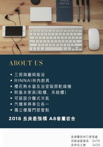 ABOUT US 三房兩廳兩衛浴 R I N N A I林內廚具 櫻花熱⽔器及浴室暖房乾燥機 附基本家具 (鞋櫃、系統櫃 ) 可裝設分離式冷氣 汽機⾞停⾞位各⼀ 獨⽴樓層⾨禁管制 2 0 1 8 ⾧庚最強檔 A 8眷屬宿舍 ⾧庚醫院林⼝管理處 洪敬翁副課⾧ 3 4 7 9 吳仲岳主辦 3 4 3 0