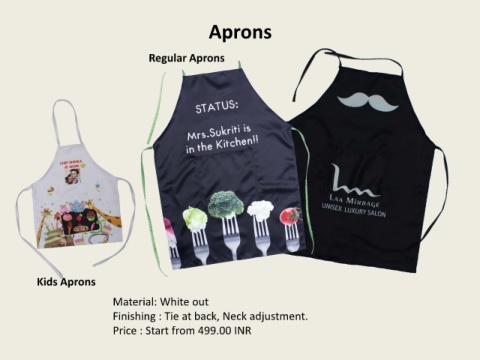 Aprons Regular Aprons Kids Aprons Material: White out Finishing : Tie at back, Neck adjustment. Price : Start from 499.00 INR