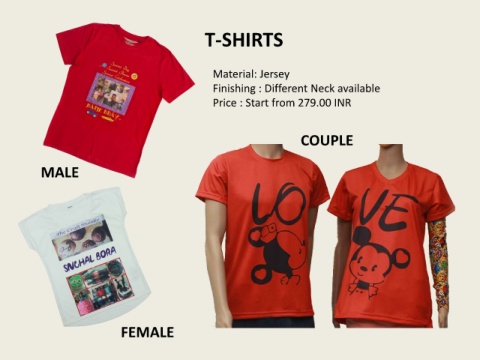 T-SHIRTS Material: Jersey Finishing : Different Neck available Price : Start from 279.00 INR COUPLE MALE FEMALE