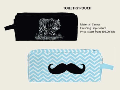 TOILETRY POUCH Material: Canvas Finishing : Zip closure Price : Start from 499.00 INR