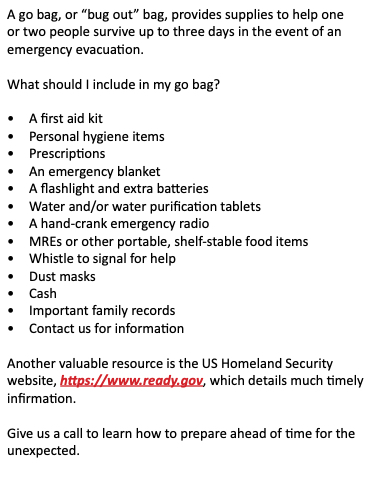 Another valuable resource is the the US Homeland Security website https://www ready gov which details much timely infirmation Give us a a a a a a call to to learn how to to prepare ahead of time for the unexpected
