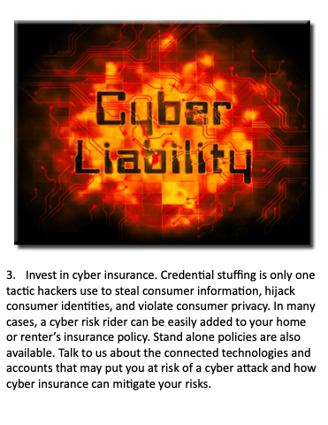 3 Invest in in ffin in cyber insurance Credential stuffing is only one tactic hackers use to steal consumer consumer consumer information hijack consumer consumer consumer identities and violate consumer consumer consumer privacy In many cases a a a a a a a a a a a a a a cyber risk rider can be be easily added to your home or renter’s insurance policy Stand alone policies are also available Talk to us about the connected technologies and and and accounts that may put you you at at a at risk risk of a a a a a a a a a a a a a a a a a cyber cyber attack and and how cyber cyber insurance can mitigate your risks