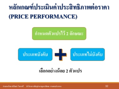 หลักเกณฑ์ประเมินค่าประสิทธิภาพต่อราคา (PRICE PERFORMANCE) ก าหนดตัวแปรไว้ 2 ลักษณะ ประเภทบังคับ ประเภทไม่บังคับ เลือกอย่างน้อย 2 ตัวแปร น ำเสนอโดย อธิวัฒน์ โยอำศรี นักวิชำกำรพัสดุช ำนำญกำรพิเศษ กรมชลประทำน 32