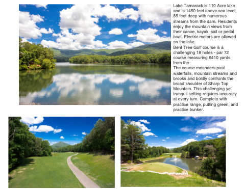 Lake Tamarack is 110 Acre lake and is 1450 feet above sea level, 85 feet deep with numerous streams from the dam. Residents enjoy the mountain views from their canoe, kayak, sail or pedal boat. Electric motors are allowed on the lake.