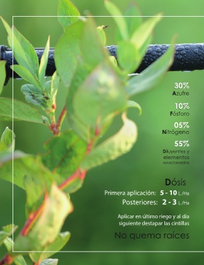 30% 30% Azufre 10% 10% Fósforo 05% 05% Nitrógeno 55% 55% Diluyentes y elementos relacionados Dósis Primera aplicación: 5 - 10 L /Ha Posteriores: 2 - 3 L /Ha Aplicar en último riego y al día siguiente destapar las cintillas No quema raíces