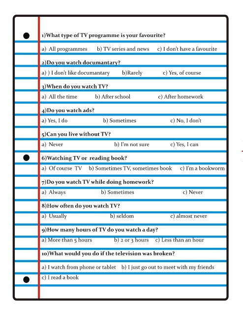 a) Of course TV b) Sometimes TV, sometimes book c) I’m a bookworm