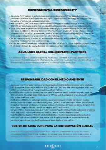 • AquaLungcreefirmementeyapoyaunmedioambientesostenible.Colaboramosconvariasentidades para la conservación del medio ambiente en todo el mundo, para así poner nuestro grano de arena en la protección y restauración de nuestros medios acuáticos y aéreos.