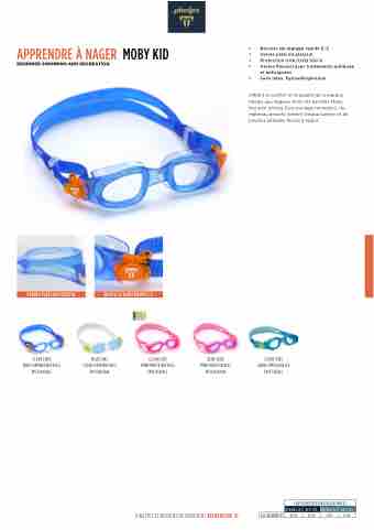 Offrant le confort et la qualité de la marque Phelps aux nageurs loisir, les lunettes Moby Kid sont dotées d’un cerclage monobloc, du matériau breveté Softeril d’Aqua Sphere et de boucles latérales faciles à régler.