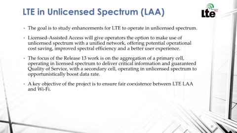 • The goal is to study enhancements for LTE to operate in unlicensed spectrum.