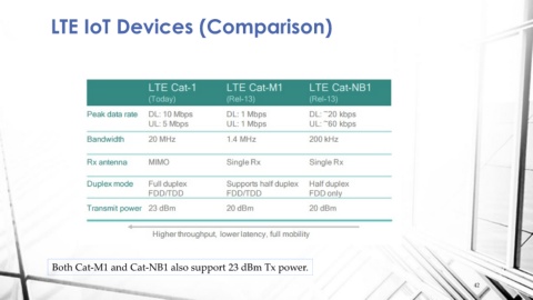 LTE IoT Devices (Comparison) Both Cat-M1 and Cat-NB1 also support 23 dBm Tx power. 42