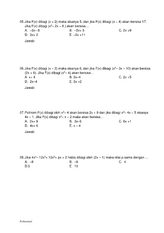 07. Polinom F(x) dibagi oleh x – 4 akan bersisa 2x + 9 dan jika dibagi x – 4x – 5 sisanya