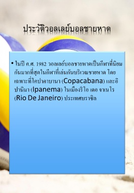ประวัติวอลเลย์บอลชายหาด •ในปี ค.ศ. 1982 วอลเลย์บอลชำยหำดเป็นกีฬำที่นิยม กันมำกที่สุดในกีฬำที่เล่นกันบริเวณชำยหำด โดย เฉพำะที่โคปำคำบำนำ (Copacabana) และอิ ปำนิมำ (Ipanema) ในเมืองริโอ เดอ จำเนโร (Rio De Janeiro) ประเทศบรำซิล