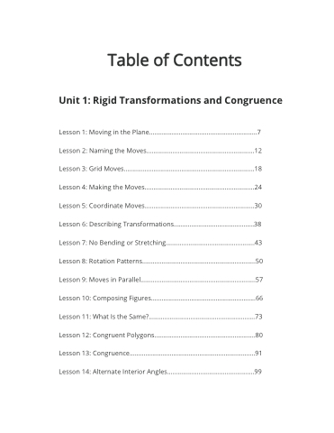 esson 1: oing in te lane.. esson : aming te oes.1 esson : rid oes.1 esson : aing te oes. esson : Coordinate oes. esson : escribing Transformations esson : o ending or tretcing. esson : Rotation atterns. esson : oes in arallel. esson 1: Comosing igures.. esson 11: at s te ame. esson 1: Congruent olgons. esson 1: Congruence..1 esson 1: lternate nterior ngles..
