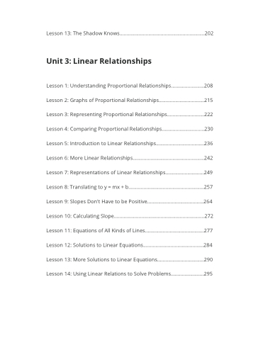 esson 1: Understanding roortional Relationsis esson : ras of roortional Relationsis.1 esson : Reresenting roortional Relationsis esson : Comaring roortional Relationsis. esson : ntroduction to inear Relationsis. esson : ore inear Relationsis esson : Reresentations of inear Relationsis esson : Translating to m b esson : loes ont ae to be ositie esson 1: Calculating loe. esson 11: uations of ll inds of ines esson 1: olutions to inear uations esson 1: ore olutions to inear uations esson 1: Using inear Relations to ole roblems