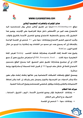 www.clickmeeting.com ًصاىع المؤتمسات والمحاضسات التعلينية أوىلاي www.clickmeeting.com Desktop WebCam. . PDF, Powerpoint, Excel … . FLV . . :ميصات هرا اليظاو . 221