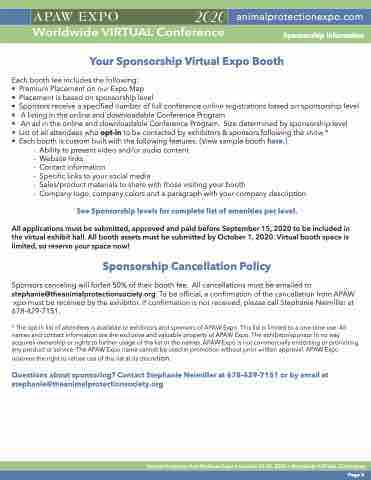 Sponsors canceling will forfeit 50% of their booth fee. All cancellations must be emailed to stephanie@theanimalprotectionsociety.org. To be official, a confirmation of the cancellation from APAW xpo must be received by the exhibitor. If confirmation is not received, please call Stephanie Neimiller at
