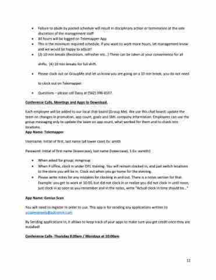 Each employee will be added to our local chat board (Group Me). We use this chat board; update the team on changes in promotion, app count, goals and SMI. company information. Employees can use the group messaging only to update the team on app count, what worked for them and to check into locations.