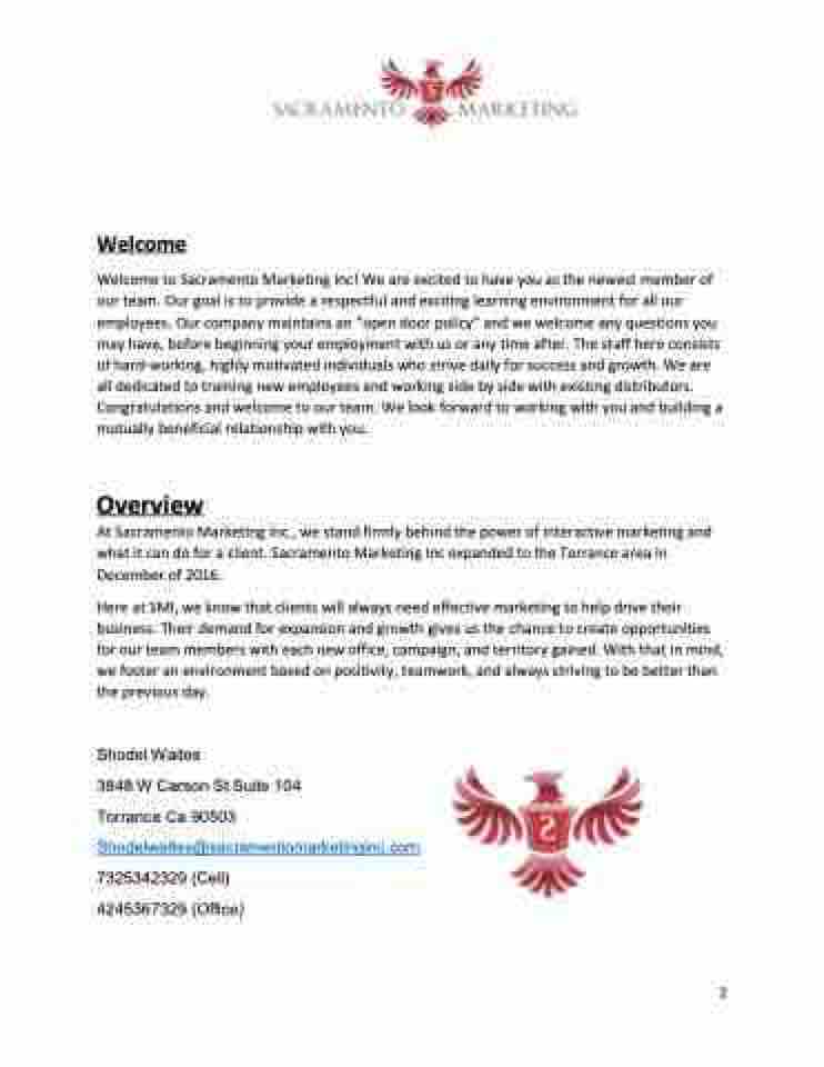Welcome to Sacramento Marketing Inc! We are excited to have you as the newest member of our team. Our goal is to provide a respectful and exciting learning environment for all our employees. Our company maintains an “open door policy” and we welcome any questions you may have, before beginning your employment with us or any time after. The staff here consists of hard-working, highly motivated individuals who strive daily for success and growth. We are all dedicated to training new employees and working side by side with existing distributors. Congratulations and welcome to our team. We look forward to working with you and building a mutually beneficial relationship with you.