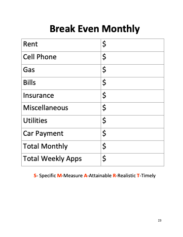 Break Even Monthly Rent $ Cell Phone $ Gas $ Bills $ Insurance $ Miscellaneous $ Utilities $ Car Payment $ Total Monthly $ Total Weekly Apps $ S- Specific M-Measure A-Attainable R-Realistic T-Timely 23