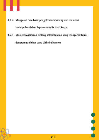 4.1.2 Mengolah data hasil pengukuran berulang dan memberi kesimpulan dalam laporan tertulis hasil kerja 4.2.1 Mempresentasikan tentang satelit buatan yang mengorbit bumi dan permasalahan yang ditimbulkannya xiii