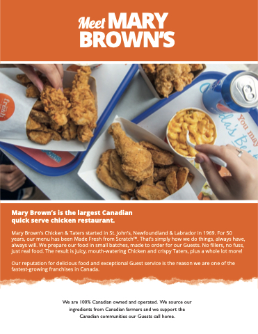 Mary Brown’s Chicken & Taters started in St. John’s, Newfoundland & Labrador in 1969. For 50 years, our menu has been Made Fresh from ScratchTM. That’s simply how we do things, always have, always will. We prepare our food in small batches, made to order for our Guests. No fillers, no fuss, just real food. The result is juicy, mouth-watering Chicken and crispy Taters, plus a whole lot more!