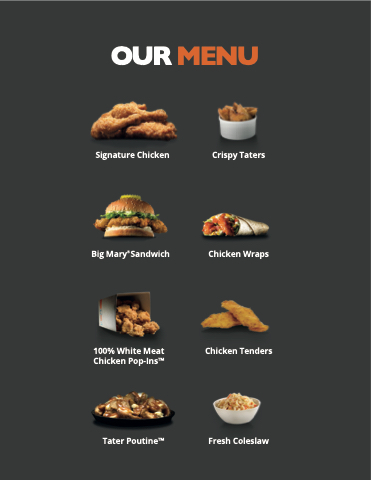 OUR MENU Signature Chicken Crispy Taters Big Mary® Sandwich Chicken Wraps 100% White Meat Chicken Pop-InsTM Chicken Tenders Tater PoutineTM Fresh Coleslaw