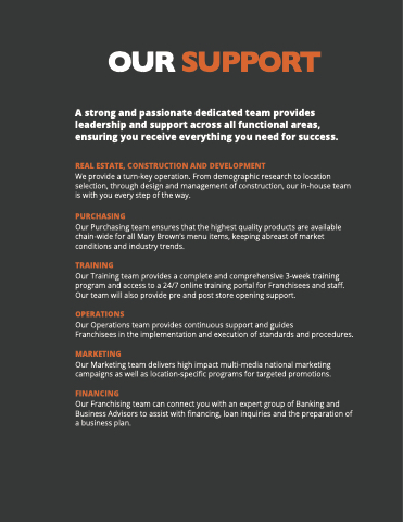 Our Purchasing team ensures that the highest quality products are available chain-wide for all Mary Brown’s menu items, keeping abreast of market conditions and industry trends.