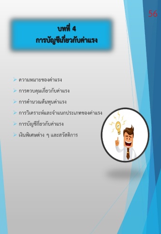 56 ควำมหมำยของค่ำแรง กำรควบคุมเกี่ยวกับค่ำแรง กำรค ำนวณต้นทุนค่ำแรง กำรวิเครำะห์และจ ำแนกประเภทของค่ำแรง กำรบัญชีกี่ยวกับค่ำแรง เงินพิเศษต่ำง ๆ และสวัสดิกำร