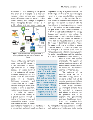 cooperative society. In my research work, I am developing a 500 W solar PV–based microgrid system for a single household that can cater lighting, cooling, mobile charging, TV and other small load requirements of a typical two- room set. The system can interact with the electricity grid for tapping extra power in case of high demand or feeding surplus power to the grid. There is two series-connected 12- V, 200-A sealed lead acid battery for energy storage, which can give 1-day backup. For power-sharing among houses, I am developing a converter that will enable the transfer of power from one house to another at a higher DC voltage if demanded by another house. The system will have a provision to enable individual houses to draw more power from the microgrid at a premium price based on manual request and automated supply system. The entire microgrid system will be controlled by a set of intelligent controllers operating at