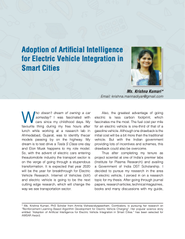 * Ms. Krishna Kumari, PhD Scholar from Amrita Vishwavidyapeetham, Coimbatore, is pursuing her research on “Reinforcement Learning Based Algorithm Development for Electric Vehicle Charging”. Her popular science story entitled “Adoption of Artificial Intelligence for Electric Vehicle Integration in Smart Cities.” has been selected for AWSAR Award.