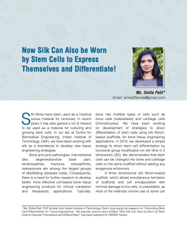 * Ms. Smita Patil, PhD Scholar from Indian Institute of Technology, Delhi, is pursuing her research on “Controlling Stem Cell Differentiation for Tissue Engineering”. Her popular science story entitled “Now Silk Can Also be Worn by Stem Cells to Express Themselves and Differentiate!” has been selected for AWSAR Award.