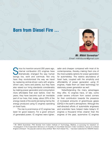 * Mr. Mikhil Surendran, PhD Scholar from Indian Institute of Technology, Madras, is pursuing his research on “Investigation of the Evaporation Behaviour of Droplets of Urea-Water-Solution Under Conditions Typical of a Diesel Engine’s Exhaust”. His popular science story entitled “Born from Diesel Fire...” has been selected for AWSAR Award.