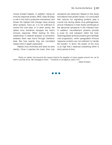 symptoms are observed. Based on this study and altered host protein levels, it is concluded that calcium ion signalling proteins play a crucial role during rabies virus pathogenesis, and an imbalance in their levels contributes to the abnormal symptoms in the infected host. In addition, neurofilament proteins provide a route for viral transport within the host. Downregulated antiviral proteins give facilitate viral progression, while upregulated immune response proteins are not sufficient to handle the burden. In short, the power of the virus is so high that it destroys everything within a short period of time.