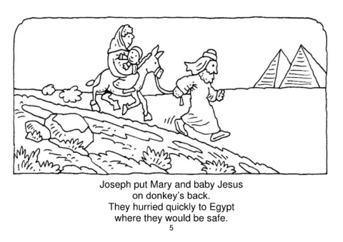 Joseph put Mary and baby Jesus on donkey’s back. They hurried quickly to Egypt where they would be safe. 5
