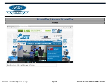 Ticket Office / Advance Ticket Office PHOTOS Question Standing Room Only available as of 12/13/17. Woodward Avenue Travel (for client use only) Page 100 2017 DEC 16 - LIONS VS BEARS - SHOP 4 - Ticketing