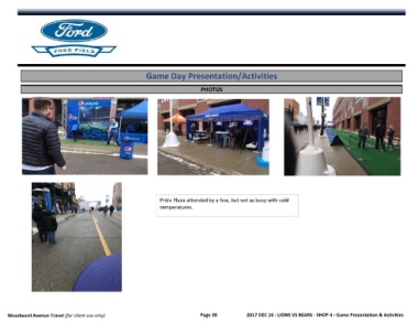 Game Day Presentation/Activities PHOTOS Question Pride Plaza attended by a few, but not as busy with cold temperatures. Woodward Avenue Travel (for client use only) Page 38 2017 DEC 16 - LIONS VS BEARS - SHOP 4 - Game Presentation & Activities