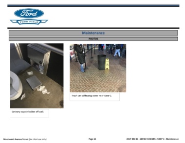 Maintenance PHOTOS Question Trash can collecting water near Gate G. Sanitary Napkin holder off wall. Woodward Avenue Travel (for client use only) Page 61 2017 DEC 16 - LIONS VS BEARS - SHOP 4 - Maintenance
