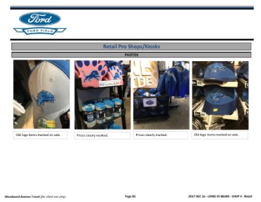 Retail Pro Shops/Kiosks PHOTOS Question Old logo items marked on sale. Prices clearly marked. Prices clearly marked. Old logo items marked on sale. Woodward Avenue Travel (for client use only) Page 82 2017 DEC 16 - LIONS VS BEARS - SHOP 4 - Retail
