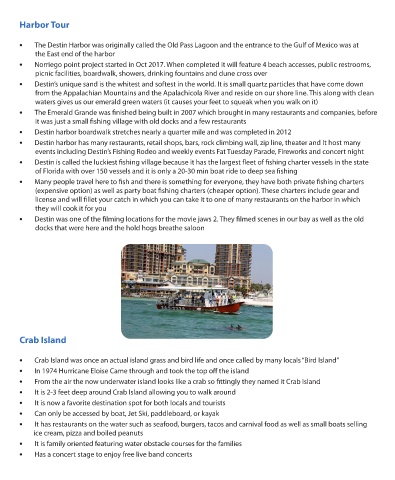 • Destin harbor has many restaurants, retail shops, bars, rock climbing wall, zip line, theater and It host many