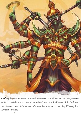 ทศกัณฐ์ เป์นกษัตริย์แห์งกรุงลงกำ ร์ำงกำยเป์นยักษ์ มี 10 หน์ำ 20 มือ มีสีกำยเป์นสีเขียว ไม์มีใครฆ์ำ