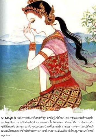 นำงเบญกำย เป์นธิดำของพิเภกกับนำงตรีชฎำ ทศกัณฐ์ได์ใช์ให์นำงเบญกำยแปลงเป์นสีดำลอยน้ ำ